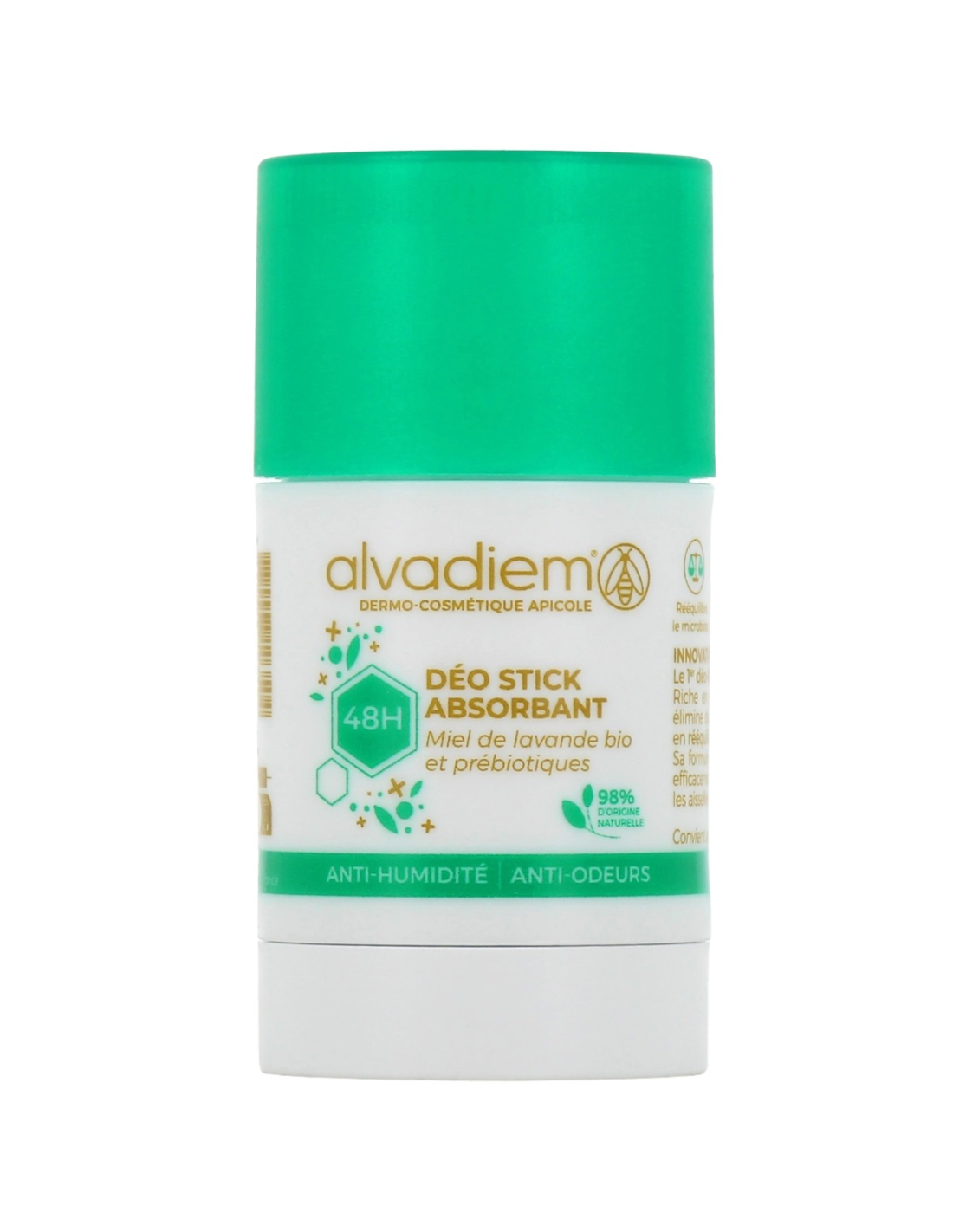 Ce déodorant naturel Alvadiem exerce une action anti-humidité et anti-odeurs. Il régule la transpiration et assure une fraîcheur longue durée. Sa formule est sans sels d'aluminium et préserve le processus physiologique d'évacuation de la sueur. Le déo stick absorbant 48h Alvadiem contient de la terre de diatomée et du kaolin qui jouent le rôle d'absorbants et réduisent la sensation d'humidité. Il renferme également du miel de lavande bio aux vertus assainissantes, et des prébiotiques qui contribuent à rééquilibrer le microbiote cutané. Ils empêchent le développement des bactéries à l'origine des odeurs de transpiration et préviennent leur réapparition.